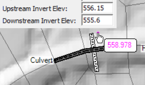 As shown in the figure below, the culvert is approximated 3ft below the cell invert on both the upstream and downstream sides. The culvert was improved by raising the invert to the cell minimum elevation.