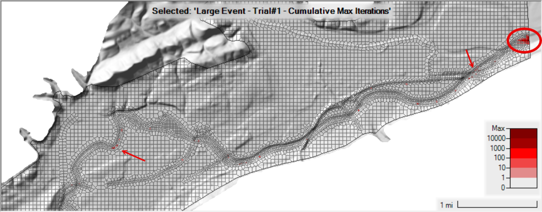 Cumulative Max Iterations - the model is iterating significantly, but the majority of iterations are near the downstream boundary.