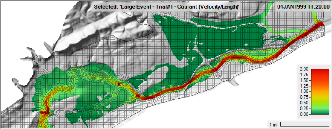 Courant Mapping - the courant map shows high values (>2) for much of the channel.