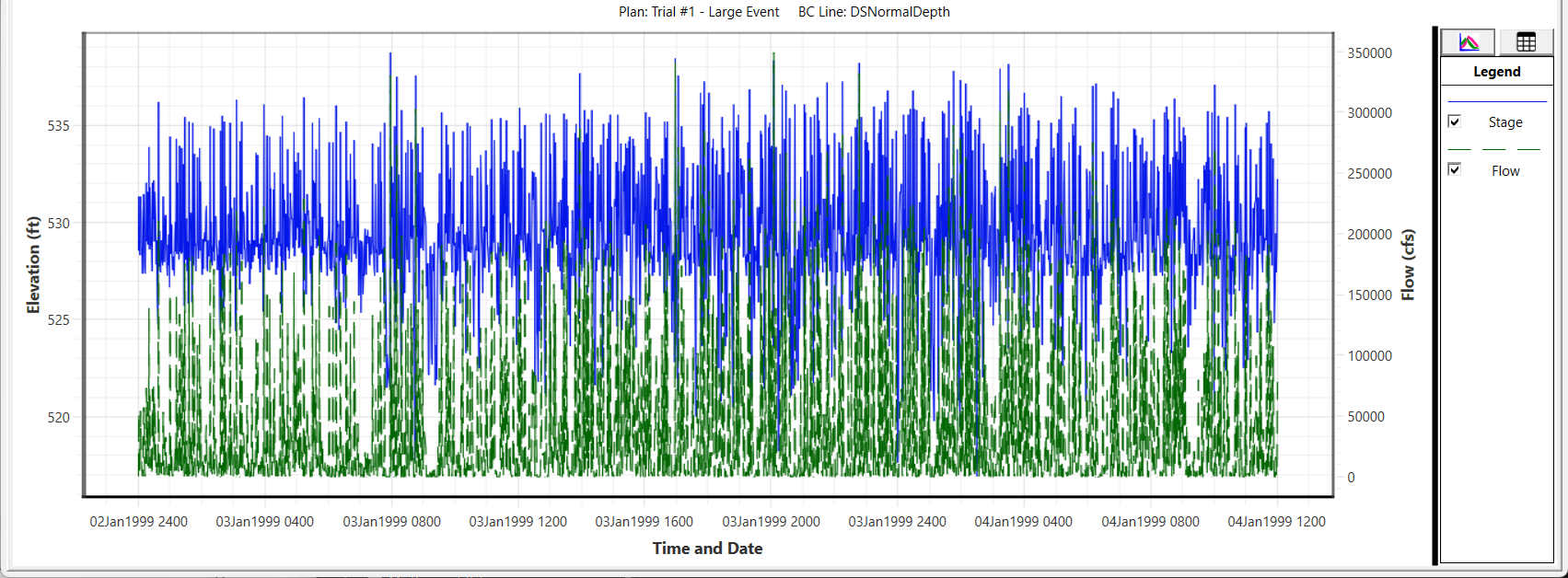 Downstream Boundary Condition - the hydrograph plot for the downstream boundary condition looks awful. This indicates an highly unstable model. We'd like to see a "smooth" hydrograph!