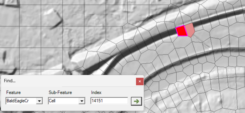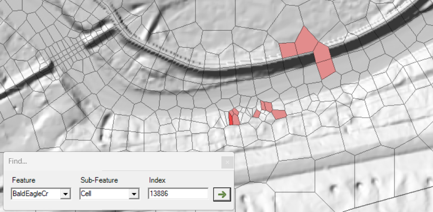 The model has significant max water surface elevation error (at cell 13734). Cell 13734 is also significant for max iterations. To find this cell, go to the Results | Trial #2 | Geometry | 2D Flow Area layer and press Ctrl+F to open the Find dialog. Type in cell 13734 and press the Arrow button - RAS Mapper will zoom to the location of interest. In the figure below, the Max Water Surface Error layer is also turned on (which could have also keyed you in.)