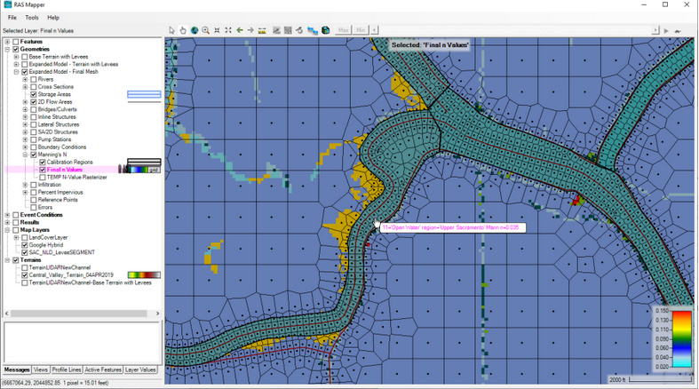 Manning’s n Calibration regions/polygons are created within the Manning’s n layer of a specific Geometry data set. To create Manning’s n calibration regions, open HEC-RAS Mapper and from the Layers window expand the Geometry layer to be edited (e.g., Expanded Model – Final Mesh in Figure 2-15). Then expand the Manning’s n layer for that Geometry data set. To create or edit Manning’s n Calibration Regions, right click on the Calibration Regions sublayer and select Edit Geometry from the shortcut menu. This option allows the user to create new regions or edit existing regions. Once a region is created user can redefine all the Manning’s n values within that region for each land cover type. An example of a model with Calibration Regions for the main channel areas is shown in the figure below.