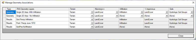 Once the user has created a Land Cover layer and added some of their own user defined classification regions, they must associate land cover layers with geometry file(s). To associate a Land Cover layer with a geometry file, right click on the Geometries layer (on the left side of the RAS Mapper window) and select Manage Geometry Associations from the shortcut menu. The Manage Geometry Associations window (Figure 2-14) opens, this window allows the user to select the desired layers to associate with each of the Geometry files in the project.