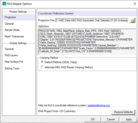 Once RAS Mapper is open, if the data is in a specific spatial coordinate projection, that projection should be set in RAS Mapper. Setting a spatial coordinate system is not required (i.e., maybe the user is just doing some testing of hypothetical data), but setting the coordinate system has many advantages in HEC-RAS and HEC-RAS Mapper. To set the spatial reference system for the project, from the RAS Mapper menu bar, select the Project |Set Projection menu item. When the Set Projection option is selected, the window shown below will appear.