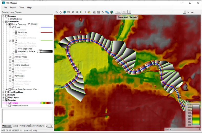 One of the major problems in hydraulic modeling is that terrain data does not often include the actual terrain underneath the water surface in the channel region. However, RAS Mapper can be used to create a terrain model of the channel region from the HEC-RAS cross sections and the Cross-Section layer’s Interpolation Surface. The created channel terrain model can then be combined with the general surface terrain model (that does not accurately depict the terrain below the water surface) to create an improved terrain model for hydraulic modeling and mapping.