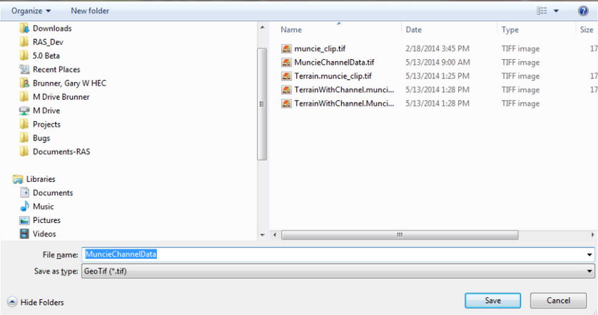 Once the geometry layers are completed, the channel terrain model is created by right clicking on the Geometry layer (parent name) and selecting Export Layer, then Create Terrain GeoTIFF from XS's (channel only). Alternatively, the user can make a terrain model out of the entire cross section region (channel and overbank area), but if the base terrain model has good overbank terrain information, the user will not want to do that. Once the Export option is selected, a file selector will appear, in which the user will need to give the new terrain model a name, and choose a directory to put it in. See the file selector in the figure below.