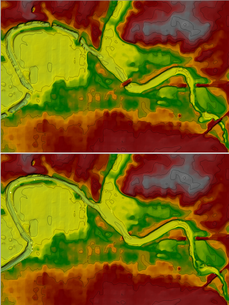 Once the user has created a channel terrain model, a new combined terrain model can be made from the base terrain model (the terrain with the overbank/floodplain data) and the newly created channel-only terrain model. To make the new combined terrain model, from the RAS Mapper menu bar, select the Tools | New Terrain menu item. The New Terrain Layer dialog opens (Figure 2-3). Note, this step is the same as previously described for creating a terrain model in RAS Mapper; however, the files used to create this terrain model will be the previously created GeoTIFF of the base terrain data, and the newly created GeoTIFF of the channel-only data. sectionOnce the New Terrain option is selected, the window to make a new terrain layer will appear (Figure 2-3). Enter a new Name for the new terrain model (“TerrainWithChannel” was used in this example). Select the folder for the new terrain model to be written to. Select the precision of the new terrain model, keeping in mind the precision should not be finer than the terrain files used to create this new terrain model. Then press the Plus (+) button and select the base terrain models GeoTIFF file, and the channel only terrain models GeoTIFF file. Make sure that the new channel-only terrain model has a higher priority than the base terrain model (i.e. make sure it is first in the list of the added terrain files). Then press Create button and a new combined terrain model will be created and added to the RAS Mapper project. See the original (terrain model without cross section data included) and the new (terrain model with cross section data included) terrain models in the figure below.