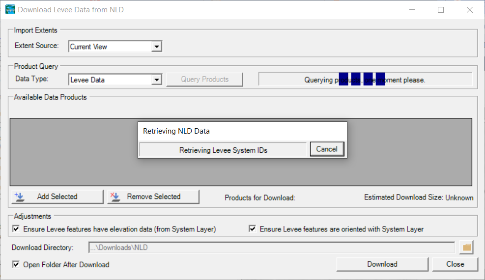 To access the NLD download tools in RAS Mapper, select the Project | Download Data | National Levee Database Features (NLD).  Select the Extent Source (Current View is the default extent) and press the Query Products button.  As shown below, a progress dialog will be invoked providing a status message.