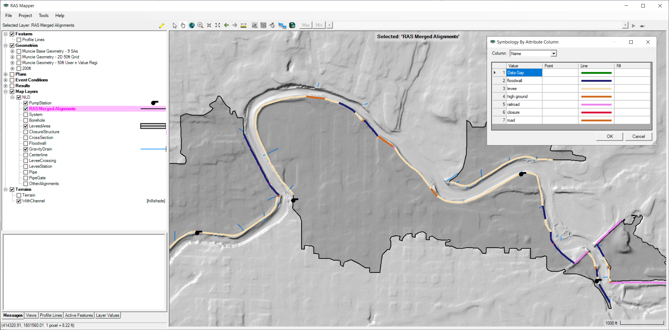 Once NLD data has been downloaded, the RASMergedAlignments shapefile can be used to create a Terrain Modification.  The High Ground Terrain Modification line type is used to implement a levee alignment.