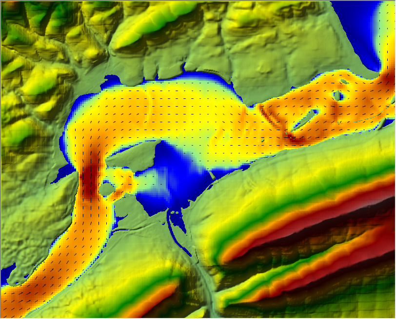 Turn on the velocity output layer by checking the box to the left of the layer. From there the user can make the Velocity layer the active layer (highlighted in pink) and select the Animation tool to animate the entire flood event. See an example 2D model Velocity plot in the Figure 6-12 below.