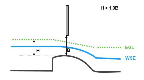 Free flow occurs when the Energy Grade Line is below the bottom of the gate. Flow is computed using the Weir Flow equation shown below, where the Energy Grade Line is used to compute the "head" above the sill of the weir, Headwater energy depth (H). Additional considerations are evaluated for user-specified weirs such as ogee crested, broad crested, and sharp crested shapes. Submergence is also considered. The simple form of the weir equation is shown below.