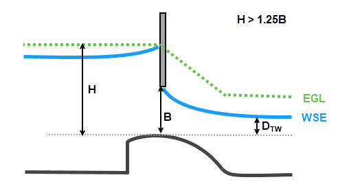 HEC-RAS is capable of modeling radial gates (often called tainter gates), vertical lift gates (sluice gates), and overflow gates. The equations used to model the gate openings can handle both submerged and unsubmerged conditions at the inlet and the outlet of the gates. When the gates are opened to an elevation greater than the Headwater energy depth (H) (defined as the difference between the Energy Grade Line and the spillway crest), the program automatically switches to modeling the flow through the gates as weir flow. When the upstream water surface is greater than or equal to 1.25 times the height of the gate opening, the orifice flow equation is applied. When the upstream water surface is between 1.0 and 1.25 times the gate opening (B), the flow is in a zone of transition between weir flow and gate flow. The program computes the upstream head with both equations and then calculates a linear weighted average of the two values (this is an iterative process to obtain the final headwater elevation for a flow in the transition range).