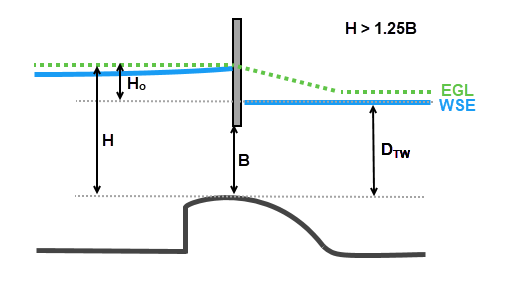 Submerged orifice flow occurs when the Headwater energy depth (H) is greater than 1.25 times the gate opening height (B) and the submergence (SB), defined as the Tailwater Depth (DTW) divided by the Headwater energy depth (H), is greater than 0.8. The submerged orifice equation is shown below, where Ho is defined by the difference between the upstream Energy Grade Line and the downstream Water Surface Elevation.