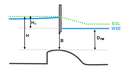 Free flow occurs when the Energy Grade Line is below the bottom of the gate. Flow is computed using the Weir Flow equation shown below, where the Energy Grade Line is used to compute the "head" above the sill of the weir, Headwater energy depth (H). Additional considerations are evaluated for user-specified weirs such as ogee crested, broad crested, and sharp crested shapes. Submergence is also considered. The simple form of the weir equation is shown below.