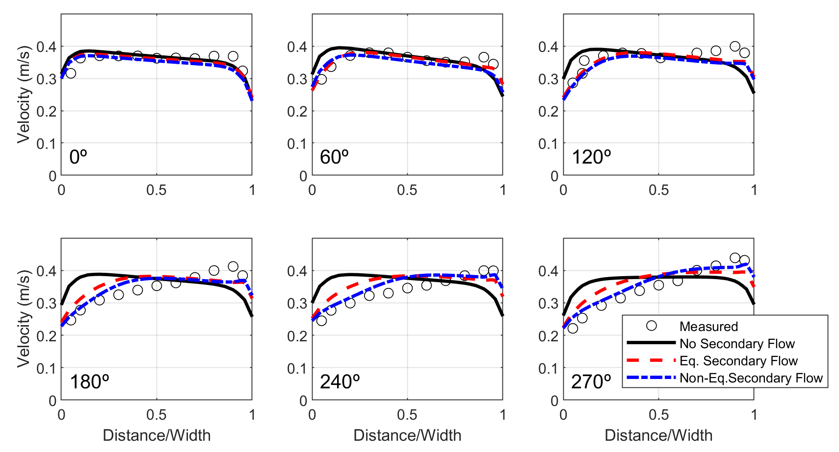 In river bends, the balance between the outward centrifugal acceleration and the inward pressure gradient produces a secondary flow which flows towards the outer bank near the surface and towards the inner bank near the bed. A new feature has been added to simulate the effect of helical or secondary flow around river bends in the shallow water equations. The approach used in HEC-RAS closely follows that from Delft3D-FLOW and has both equilibrium and non-equilibrium formulations. Example results are shown here for the flume experiments from Steffler (1984). The computational grid was generated in HEC-RAS 2025 and has 21 cells across the channel. A comparison of HEC-RAS velocity profiles at different transects along the flume is shown below. The results are computed without secondary flow, with equilibrium secondary flow and with non-equilibrium secondary flow. Overall, the HEC-RAS results with secondary flow show good agreement with measurements. This non-equilibrium secondary flow approach is more accurate, especially at the downstream end of the flume, but the equilibrium approach offers a good compromise between accuracy and computational efficiency since it is approximately 40% faster in this case.