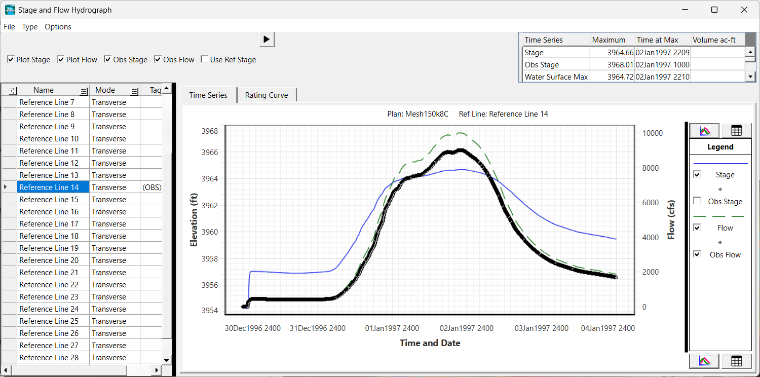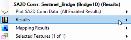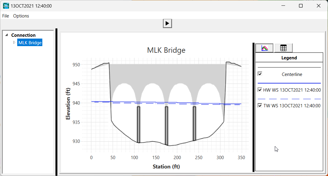 The hydrograph plot now incorporate a table for more efficient access to plots of the same type. As shown in the figure below, all of the 2D Connections are directly available in the list to the left of the plot. This workflow is available for Boundary Conditions, Reference Lines, 2D Faces, etc. Below is an example of the hydrograph plot for multiple bridges and culvert openings.
