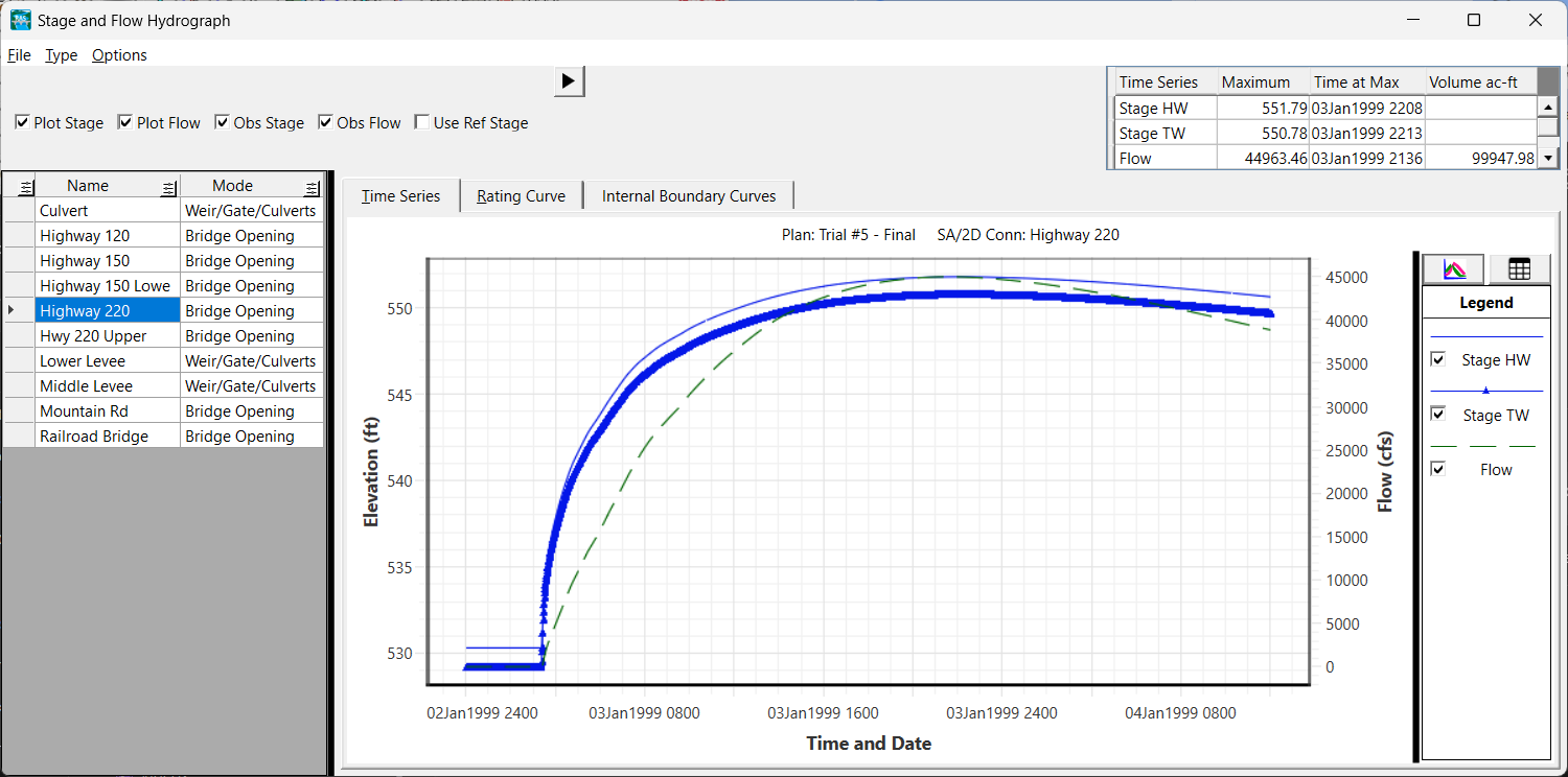 The Stage and Flow Hydrograph plotter has undergone major changes. The Stage and Flow Hydrograph Plot now has option buttons to see all plots for all computational node types in one window. This includes for time series data plots, profile plots, hydraulic table property plots, and breach information. This output will continue to improve with 6.7 Beta 5. To learn more about what is available, check out the User's Manual.