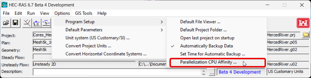The addition of "efficiency cores" added to new CPUs now allows computers to more efficiently perform computations at the expense of speed performance. The previous method in HEC-RAS for determining the available number of processing cores did not differentiate between "performance cores" ("p-cores") and "efficiency cores" ("e-cores") which could result in slower run times. With HEC-RAS 6.7 Beta 4, RAS implements a new method for determining the availability of p-cores and limiting the solver to just those cores during 2D simulations. To enable CPU options, select the Options | Program Setup | Parallelization CPU Affinity menu item.