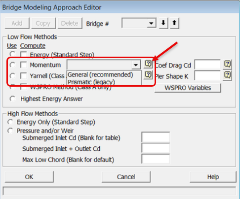 The old method is referred to now as "Prismatic (Legacy)" and the new method as "General (Recommended)". You can read more on Low Flow Momentum Bridge Computations in the Hydraulic Reference Manual and is easily accessed by clicking the Help button on the Bridge Modeling Approach editor, as shown below.