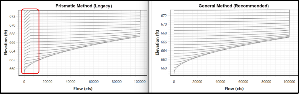 The momentum method for low flow through bridges (1D bridges and 2D models with bridges of type "1DFamily of Rating Curves") has been improved to handle bridges where the upstream and downstream cross section areas differ significantly. In such cases, the Legacy method could result in poor hydraulic tables for the low flow portion of the curves, as shown in figure below.