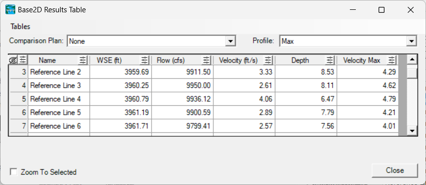- Show Results Table will invoke a table of computed hydraulic variables for each Reference Line.