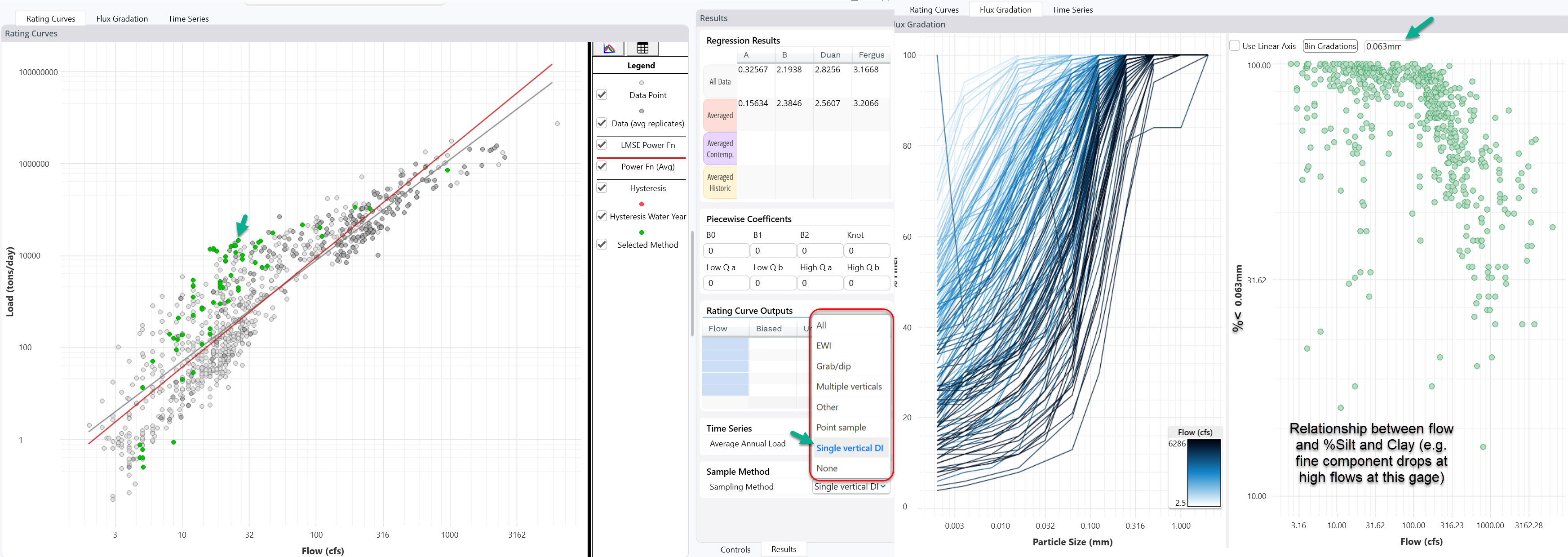 HEC updated the sediment rating curve calculator to read the new water quality format (the USGS discontinued the old format making the tool inoperable). The USGS still has not made the text search functionality available, but users can apply the tool if they have a gage number for now. HEC also added two new analyses: view data by sampling type and a % fine mode in the grain size analysis (because many gages have more sand-silt split data than grain size distributions).