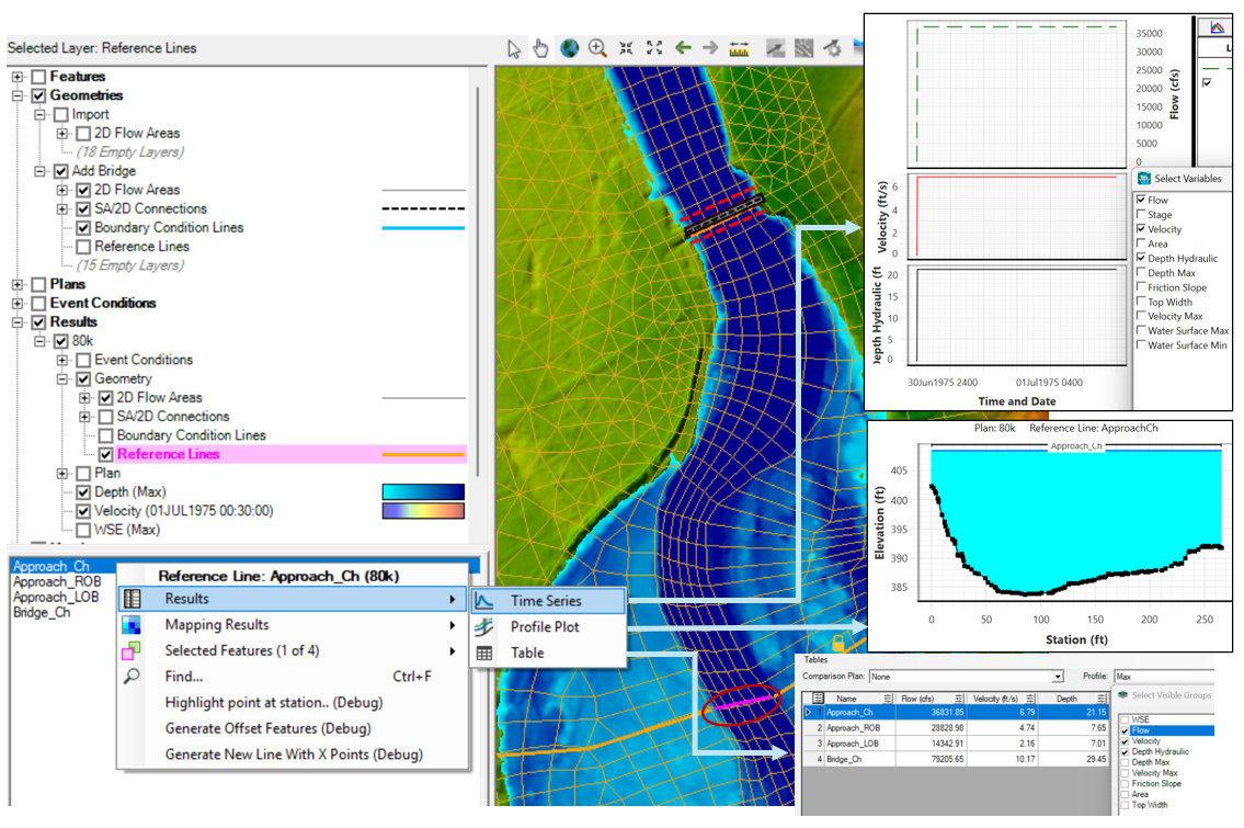 HEC added new average and max variables to the reference lines including average and max, velocity, and hydraulic depth as well as the flow, area, top width and friction slope of the flow across the reference line (variables used for bridge scour calculations). The 6.7 Beta 2 also includes tools to access these results directly from mapper, in summary tables, and as classic cross section plots.