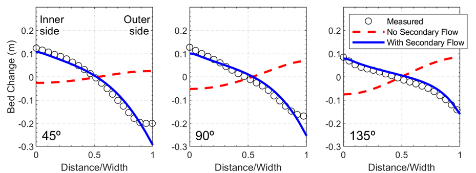 HEC-RAS 6.7 Beta 5 includes the effects of secondary flow in 2D sediment transport (see 2D Sediment Transport). Secondary flow at river bends is caused by the balance between the outward centrifugal acceleration and the inward pressure gradient and produces a flow towards the outer bank near the surface and towards the inner bank near the bed. The effects of secondary flow on sediment transport are to produce a suspended sediment dispersive flux towards the inner side of the bend as well as a deviation of the bed-load transport towards the inner side of the bend. These effects are balanced by the bed-slope effects. A an example validation result the figures below show computational results for the laboratory flume study of Koch and Folkstra (1980). The flume channel has a rectangular cross-section with a width of 1.7 m and a longitudinal bedslope is 0.18%. The ratio of the mean radius of curvature to the width is 2.5 m which represents a sharply curved channel. A constant upstream flow of 0.17 m3/s and downstream stage of 0.2 m were applied. The sediment median grain size is 0.78 m. The lower left figure shows a map of the final bed change including the effects of secondary flow. The computed bed change shows erosion on the outer side of the bend and deposition on the inner side. The lower right figure shows a comparison of the bed change with and without secondary flow compared to laboratory measurements. The bathymetry was compared at three transects at angles of 45, 90, and 135 degrees along the bend. The HEC-RAS results compare well with measurements.