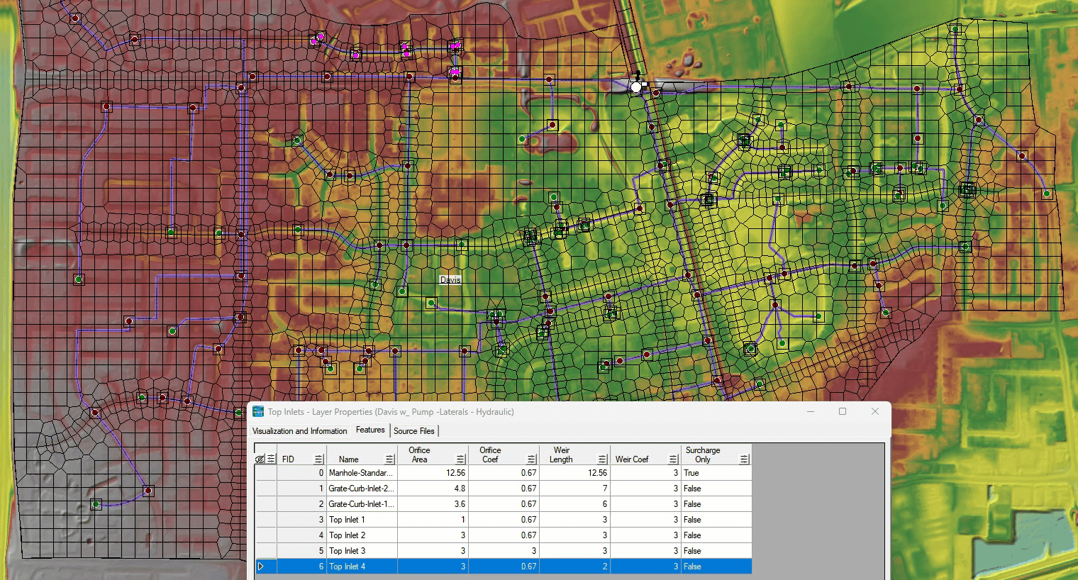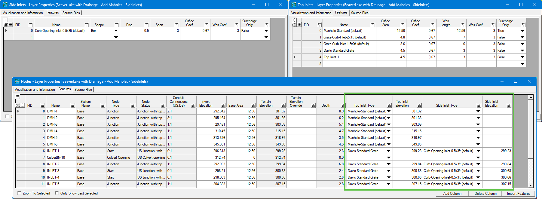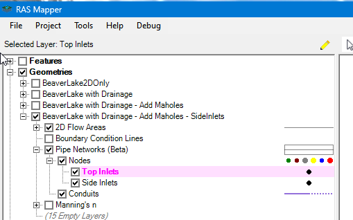 Drop Inlets have been replaced by Top Inlets, a new Layer under Nodes in the RAS Mapper Tree. This change allows a Top Inlet to be defined in the Top Inlet attribute table once, and then attached to many nodes throughout the Pipe Network. Existing Drop Inlets will be converted to Top Inlets automatically, but the old Drop Inlet columns remain in the node attribute table only for reference and can be deleted.