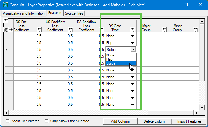 HEC-RAS now has the capability to model sluice style gate inside of Pipe Networks. Adding a sluice gate can be accomplished in the Conduits attribute table using the DS Gate Type field as shown below. Gates can be used on the ends of Pipe Networks controlling flows from the surface, or they can be used inside of Pipe Networks to control flows from node to node.