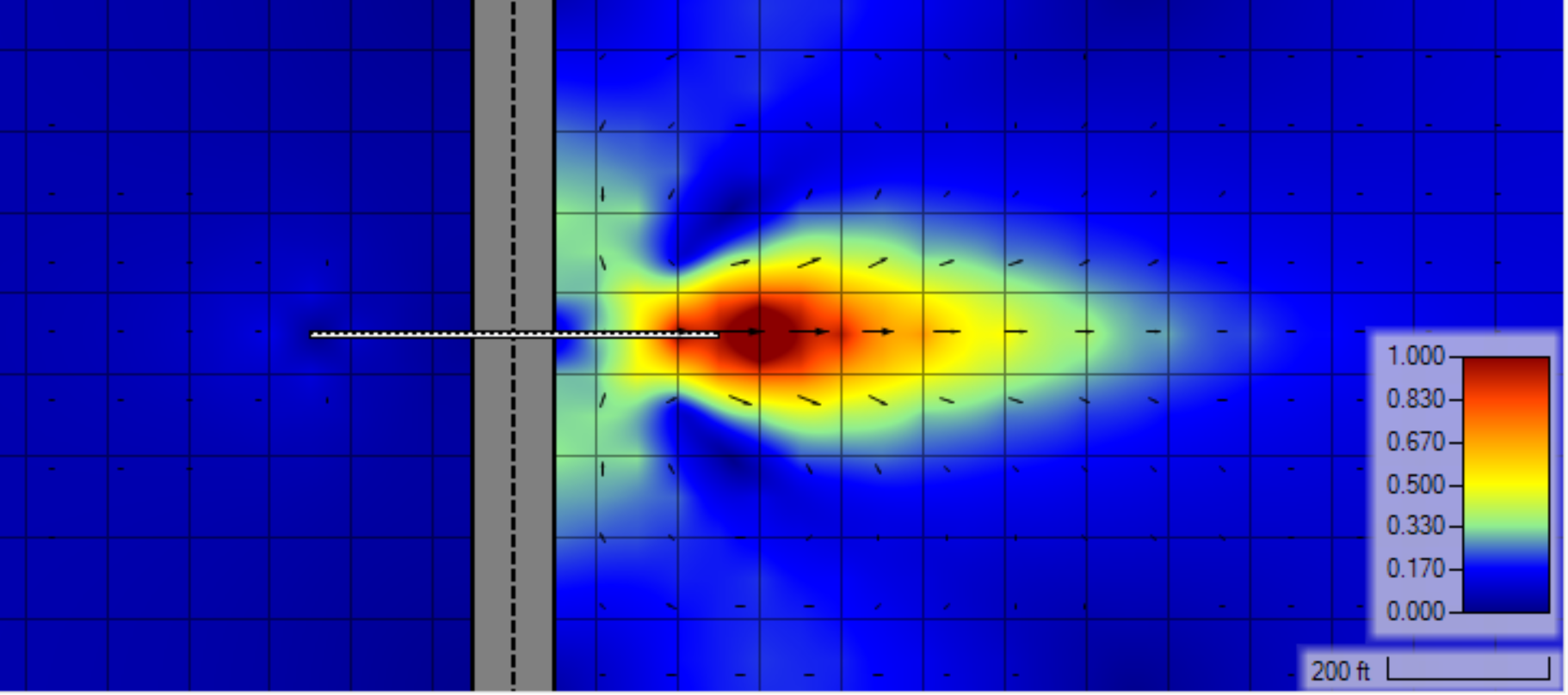 Momentum from georeferenced culvert outflows is now included in 2D Flow Areas with Shallow Water Equations. Georeferenced culverts are culverts for which the coordinates of the culvert layout are specified. The outflow from culverts introduces momentum into the 2D Flow Area cells. The feature does not work for non-Georeferenced culverts or when using the Diffusion Wave Equation. The figure below shows an example of a lateral structure with geo-referenced culvert with flow from left to right. The culvert outflow produces a local circulation including a water jet and water entrainment near the lateral structure.