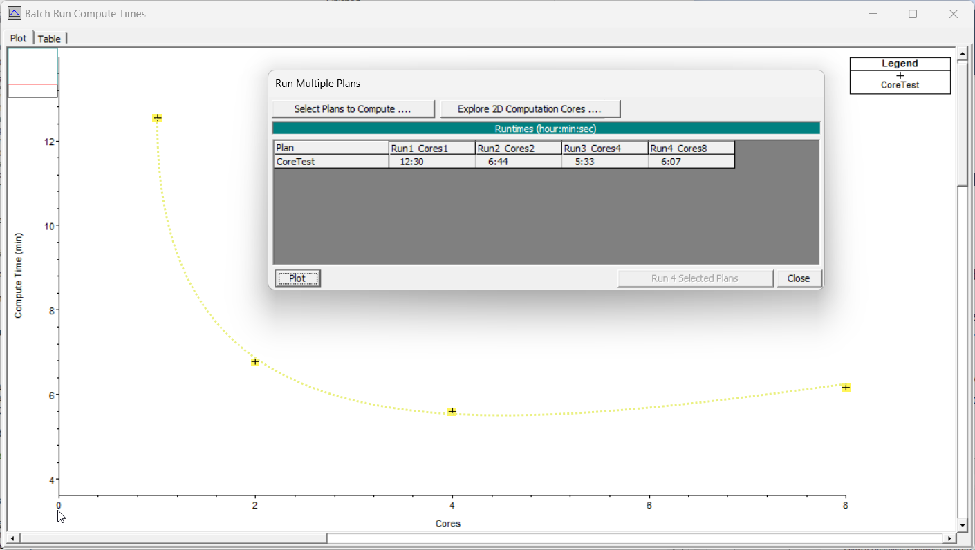 Investigation into the number of solver cores that would be most efficient for a model simulation for has been added in HEC-RAS under the Run Multiple Plans option. This option allows you to quickly set up multiple simulations with a different number of processors to see the effect on run times consolidated into a single table. For more information see Run Multiple Plans.