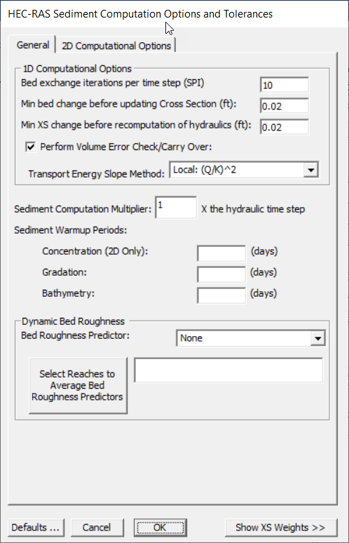HEC-RAS includes several settings and model coefficients under the Options menu of the Sediment Analysis dialog. Many of these Options are identical to those in the Steady Flow Analysis dialog and are documented in The Steady Flow manual. However, there are four Options specific to Sediment Transport Analyses. Sediment specific options include the Sediment Computation Options and Tolerances,Transport Energy Slope, and Sediment Output Options menu items available from the Options menu of the Sediment Transport Analysis window. When this option is selected, a window will appear as shown in the figure below.