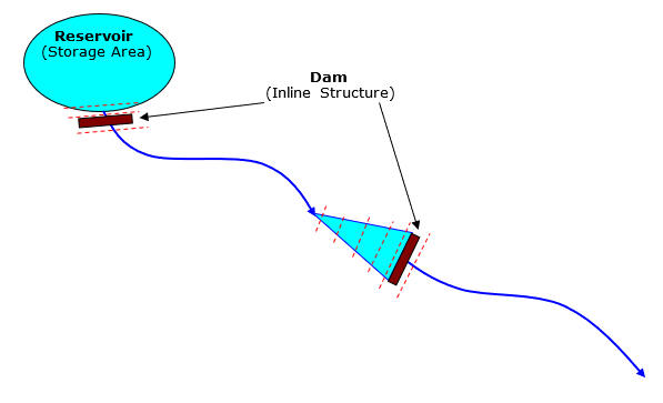 The lake area upstream of the dam can either be modeled with cross sections, a storage area (Figure 14-4.), or a 2D Flow Area. If cross sections are used, then HEC-RAS will perform full unsteady flow routing through the reservoir pool and downstream of the dam. If a storage area is used, HEC-RAS uses level pool routing through the lake, then unsteady flow routing downstream of the dam. If a 2D Flow Area is used then full 2D modeling can be used within the reservoir pool and downstream of the dam. When using a storage area to represent the reservoir pool, HEC-RAS requires two cross sections inside of the reservoir pool, then the inline structure representing the dam, and then the downstream cross sections (see Figure 14-4). The routing reach is hydraulically connected to the reservoir (storage area) with the first (most upstream) cross section. This cross sections water surface is forced to the elevation of the water surface in the storage area during the unsteady flow routing. The second cross section in the pool area is required as a bounding cross section for the inline structure (the dam).