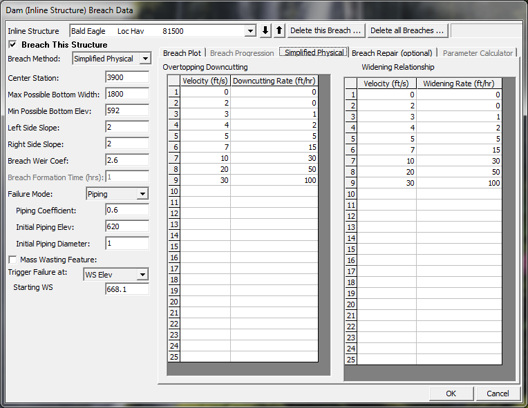 Velocity vs. Downcutting and Widening Erosion Rates. When using the "Simplified Physical" breaching option, the user is required to enter velocity versus Downcutting erosion rates, as well as velocity versus erosion widening rates. To enter this data the user selects the "Simplified Physical" breach Tab. When this Tab is selected the editor will look like the following: