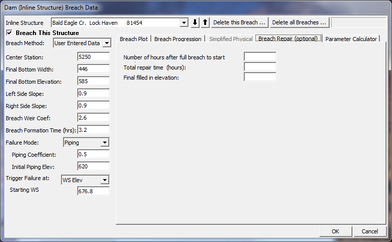 Figure 14 8. Dam Break Editor with Breach Repair Tab Active.