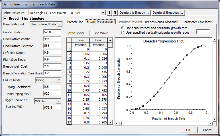 Figure 14 7. Dam Breach Editor with Nonlinear Breach Progression