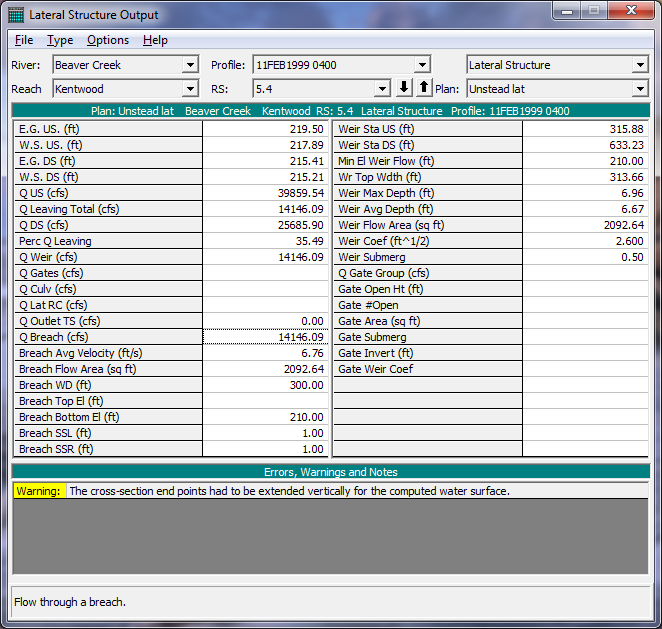 Referring to Figure 14-21 and Figure 14-22, as the levee breaches, the flow going into the storage area and the stage increase quickly, while the stage and flow in the main river drop. In addition to the graphics in HEC-RAS, tabular results are also available. Shown in Figure 14-23 is a detailed output table for the lateral structure. The user can select a specific time line for viewing the output by selecting a specific profile. The profiles are labeled by the date and time they occurred in the model simulation.