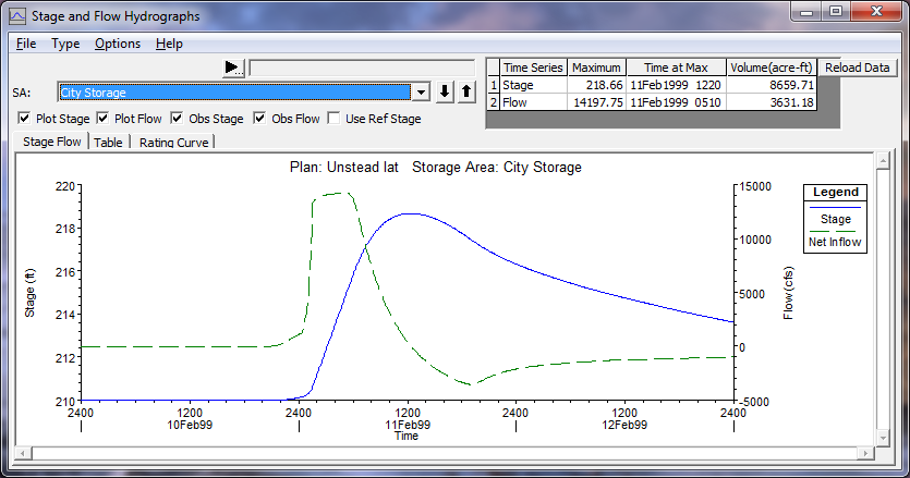 In addition to the profile plot and the lateral structure hydrographs, it is a good idea to plot the stage and flow hydrographs for the storage area. This allows the user to easily see the amount of flow coming into and out of the storage area, and the change in the water surface elevation. Shown in Figure 14-22 is the stage and flow hydrograph for the storage area in this example.