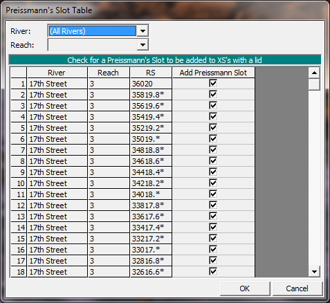 The Preissmann Slot table will show all cross section locations that contain lids. The user can turn on or off the Preissmann slot option by simply checking the box next to the desired cross section location. All of the check boxes can be turned on or off simultaneously by clicking on the Add Preissmann Slot column heading at the top of the table.