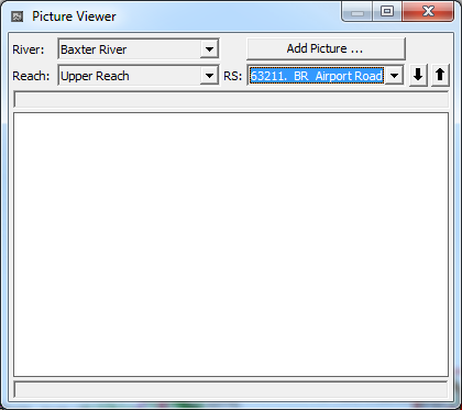 Once pictures are attached to the viewer, the user can move to different pictures by using the up and down arrow buttons, or selecting a specific river stationing that has a picture attached to it. Options are available to zoom in, zoom full, and Pan by right clicking on the picture. Additionally, when a picture is loaded, the Add Picture button changes to Remove Picture in order to delete it. The user can resize the picture viewer to whatever size they want. However, if you are viewing a bitmap picture, and you make the window larger than the actual picture resolution, the photo will begin to distort.