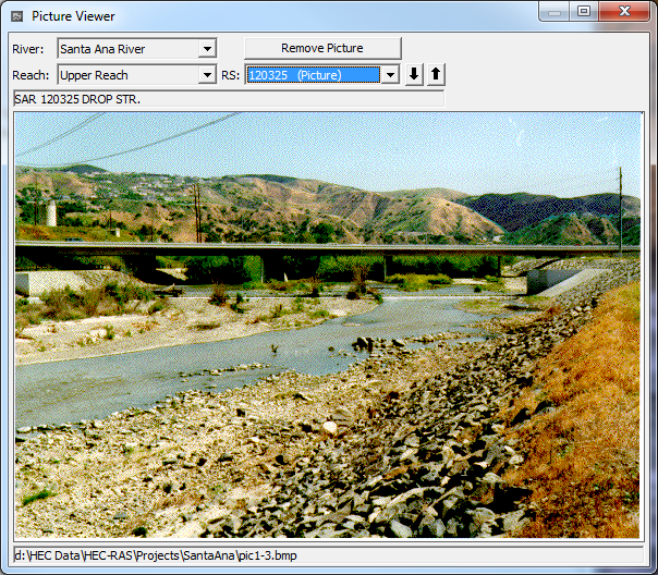The user can attach a picture to any cross section or hydraulic structure (bridge, culvert, etc.). Once pictures are attached, they can be viewed from a picture viewer within the HEC-RAS geometric data editor. The picture viewer supports the following graphics formats: bit map (.bmp); icon (.ico); windows metafile (.wmf); GIF (.gif); and JPEG (*.jpg).