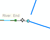 Next, select the Edit tool and grab the endpoint of a river reach line by pressing and holding the left mouse button. Move it towards another reach endpoint. When the point is within the snapping tolerance, a sketch of the endpoint will appear and snap to the endpoint. Release the mouse button and the endpoint will snap. The progression of steps to snap endpoints in illustrated in Figure 5-105.