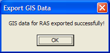 After pressing OK, GeoRAS will export the GIS data to an XML file and then convert the XML file to the SDF format. Two files will be created: "GIS2RAS.xml" and "GIS2RAS.RASImport.sdf". This process will take several seconds. The dialog shown inFigure 5-109 will appear when the process is has successfully created the files. You now have a file you can import into your RAS model.