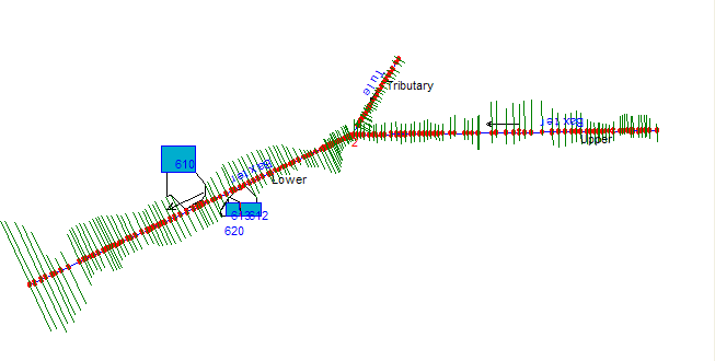 The Stream Centerline is used to establish the river reach network and is shown in Figure 5-103. The river network must be digitized in the direction of flow with reach end points coincident at junctions.