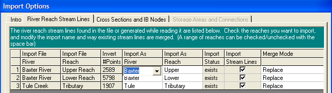 HEC-RAS thinks that the river reaches are new because the names in the import file do not match those that are in the existing RAS model. Select the appropriate names to import the river and reaches to by using the list boxes in the Import As columns. When completed, the Import Status will change to "exists", as shown in Figure 5-115.