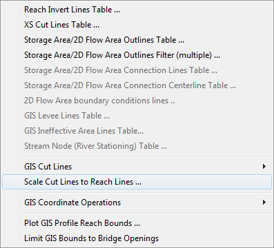 By default, the Geometric Schematic scales the display of the cross sections based on the river network. This is handy when the data is not georeferenced (when the river schematic is very short when compared with real world distance), but we want to turn this option off when we georeference the cross sections. Select the GIS Tools| Scale Cut Lines to Reach Lines menu item, as shown in Figure 5-123, to remove the check.
