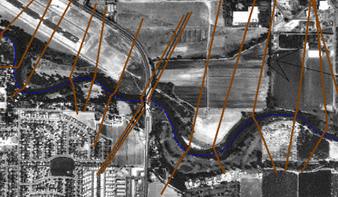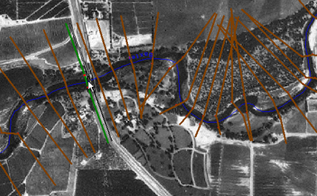 Figure 5‑128. Bridges not perpendicular to the river require moving the bounding sections.