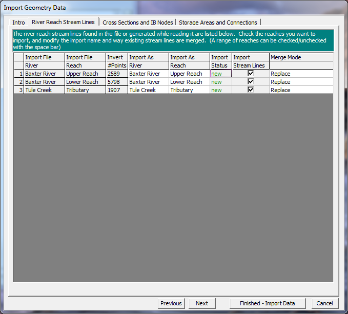 Merge Mode | The river reach can replace existing data, append upstream, or append downstream. |