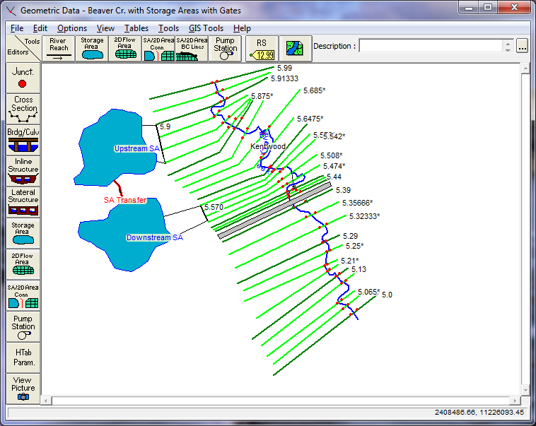 Storage Areas are lake like regions in which water can be diverted into or from. Storage areas can be located at the beginning of a reach (as an upstream boundary to a reach), at the end of a reach (as a downstream boundary to a reach), or they can be located laterally to a reach. Storage areas can be connected to a river reach by using a lateral structure connection. Storage areas can be connected to another storage area by using a storage area connection. Storage area connections can consist of a weir and gated spillways; a weir and culverts; just a weir; or a linear routing option. An example river system with storage areas is shown in Figure 5 39.